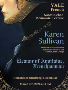 The Yale French Department is delighted to welcome Karen Sullivan, Irma Brandeis Professor of Romance Literature and Culture at Bard College, to campus for the 2026 Naomi Schor Memorial Lecture*. Professor Sullivan will present a lecture entitled “Eleanore of Aquitaine, Frenchwoman,” drawn from her recent book, book Eleanor of Aquitaine, as It Was Said: Truth and Tales about the Medieval Queen (University of Chicago Press).